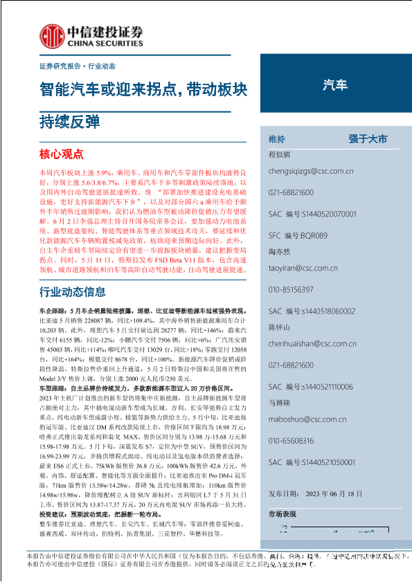 【中信建投证券】【20230618】汽车行业:智能汽车或迎来拐点,带动板块持续反弹-19页