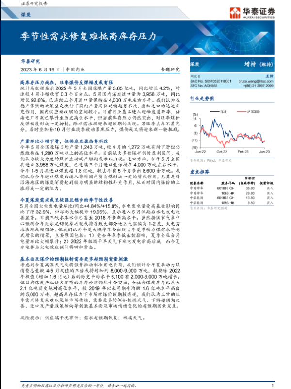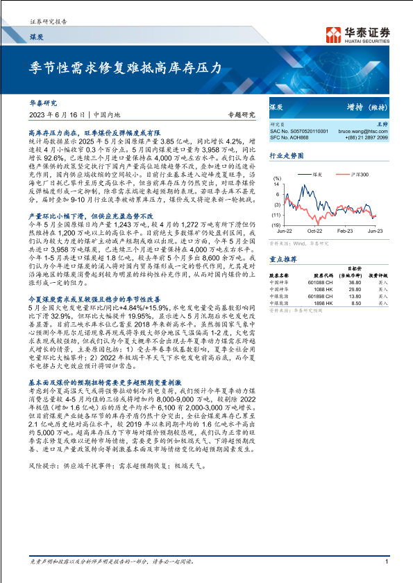 【华泰证券】【20230616】煤炭行业专题研究:季节性需求修复难抵高库存压力-16页