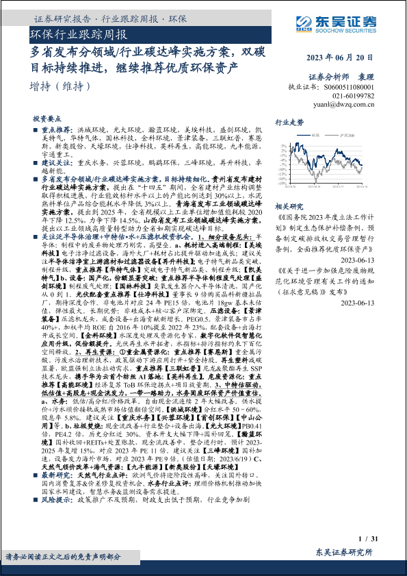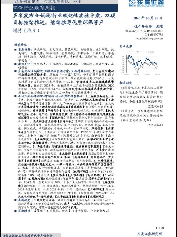 【东吴证券】【20230620】环保行业跟踪周报:多省发布分领域行业碳达峰实施方案,双碳目标持续推进,继续推荐优质环保资产-31页
