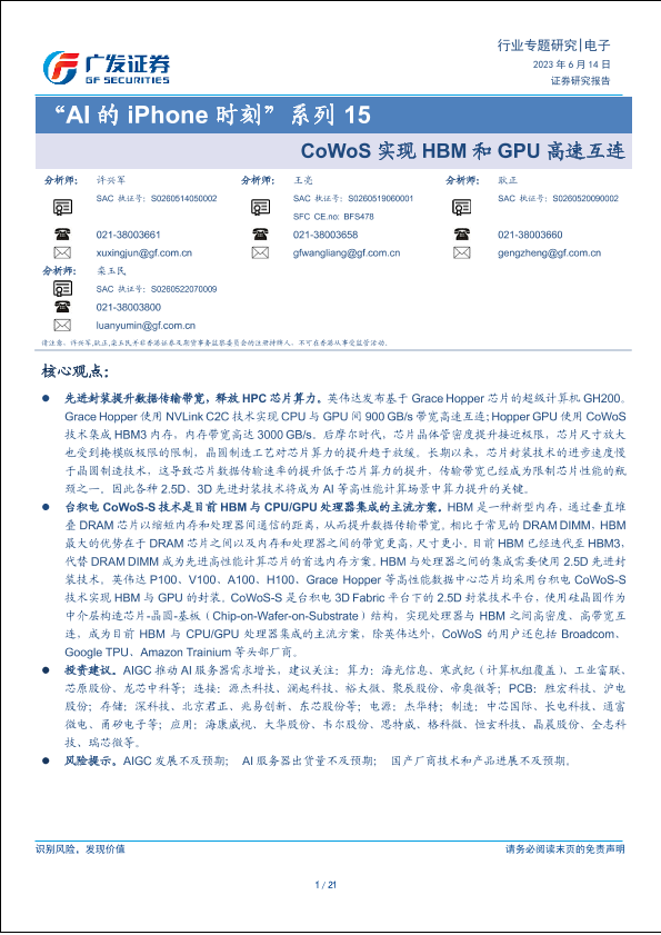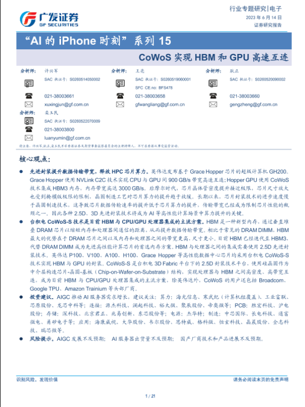 【广发证券】【20230614】电子行业专题研究:“AI的iPhone时刻”系列15 CoWoS实现HBM和GPU高速互连-21页