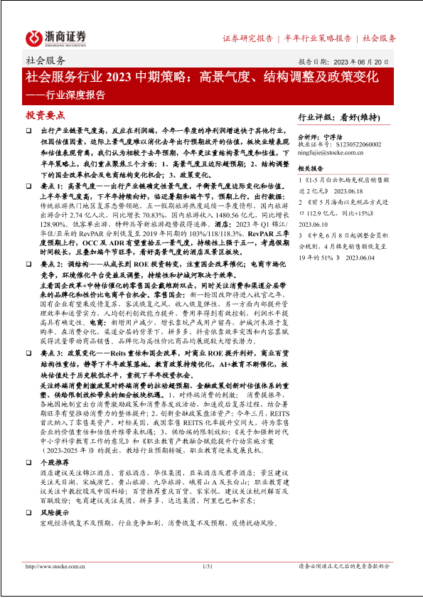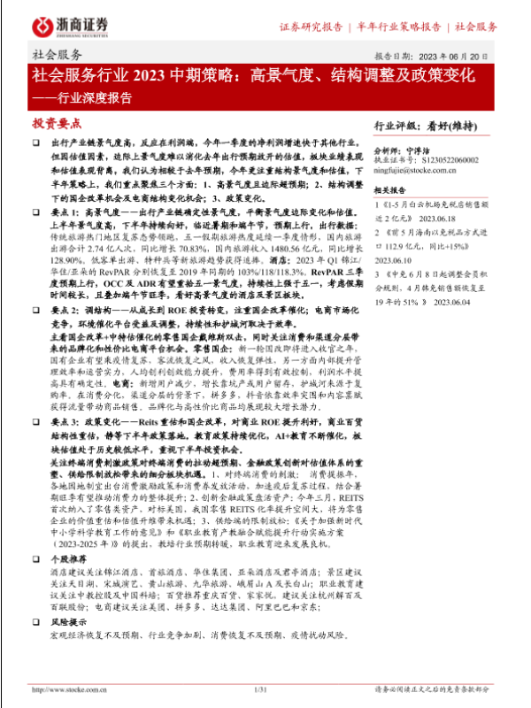 【浙商证券】【20230620】社会服务行业2023中期策略:高景气度、结构调整及政策变化-31页