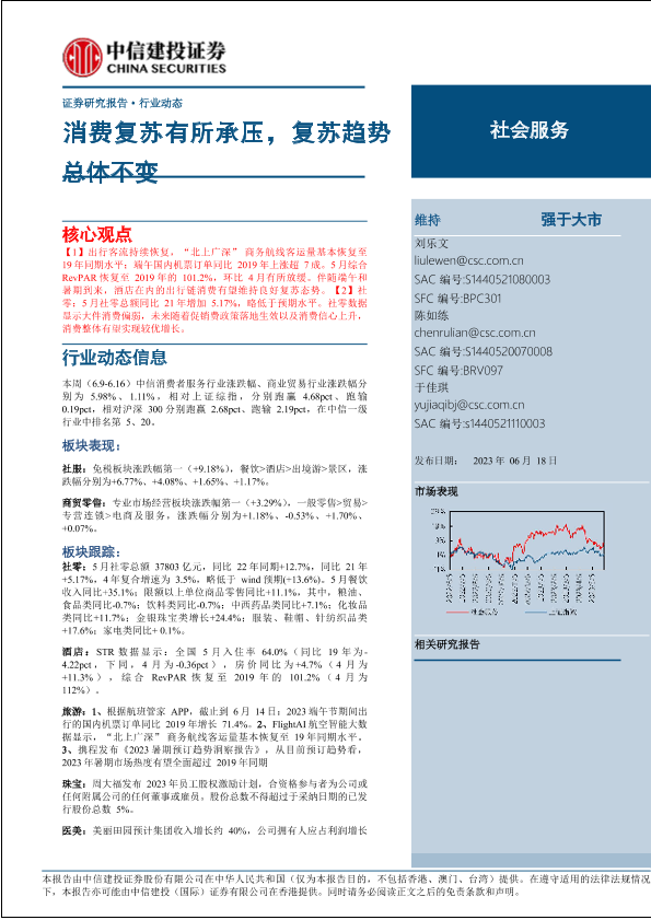 【中信建投证券】【20230618】社会服务行业:消费复苏有所承压,复苏趋势总体不变-30页