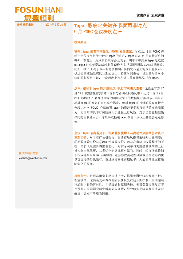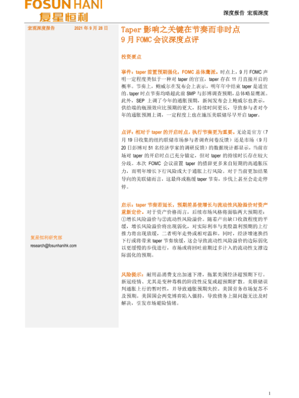 【复星恒利】【20210928】9月FOMC会议深度点评:Taper影响之关键在节奏而非时点-17页