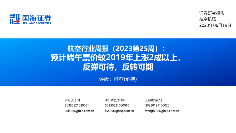 【国海证券】【20230619】航空行业周报(2023第25周):预计端午票价较2019年上涨2成以上,反弹可待,反转可期-31页
