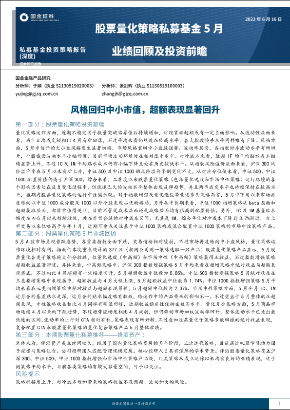 【国金证券】【20230616】股票量化策略私募基金5月业绩回顾及投资前瞻:风格回归中小市值,超额表现显著回升-19页