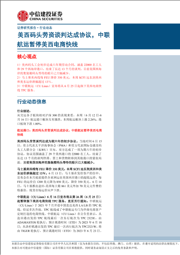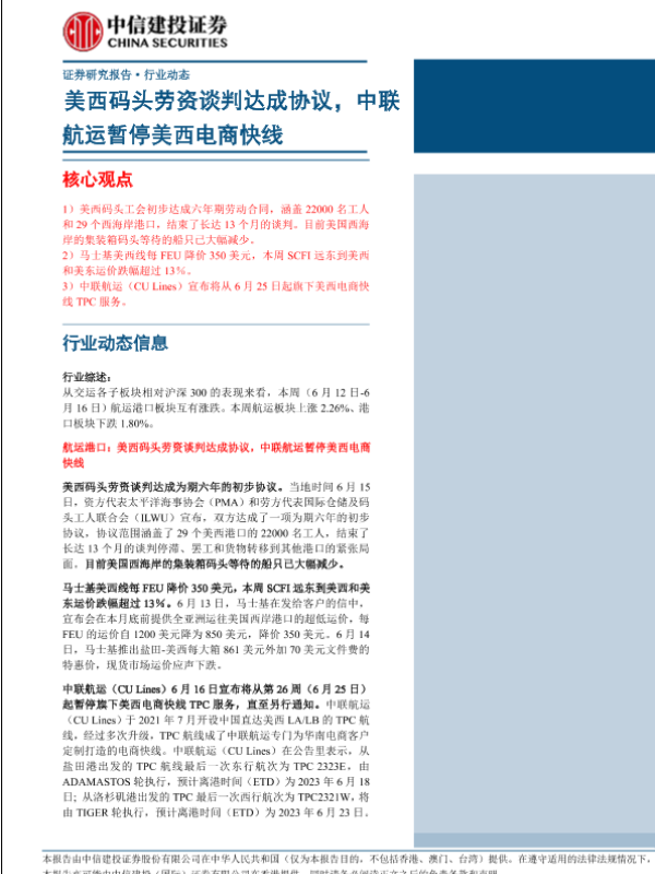 【中信建投证券】【20230617】航运港口行业:美西码头劳资谈判达成协议,中联航运暂停美西电商快线-28页