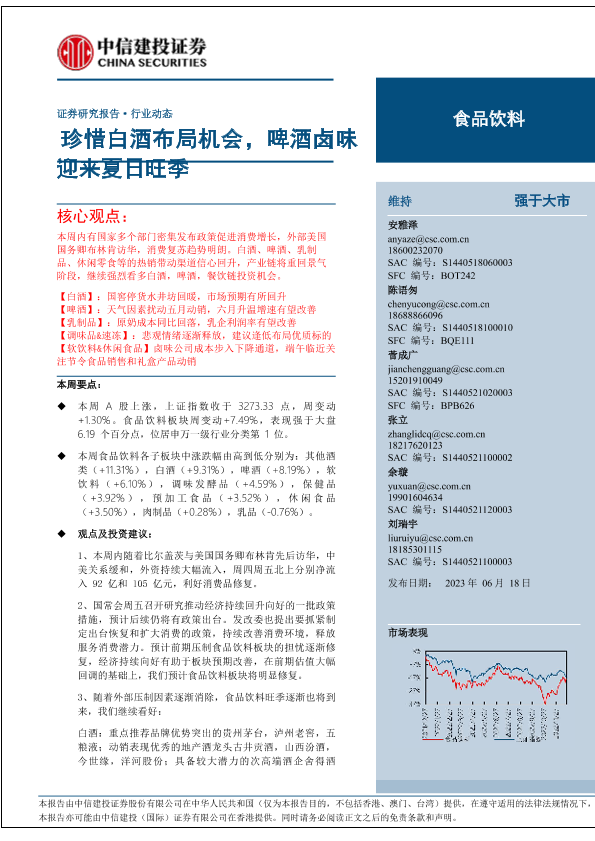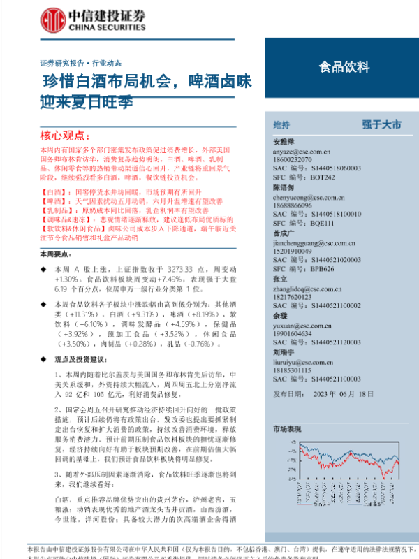 【中信建投证券】【20230618】食品饮料行业动态:珍惜白酒布局机会,啤酒卤味迎来夏日旺季-28页