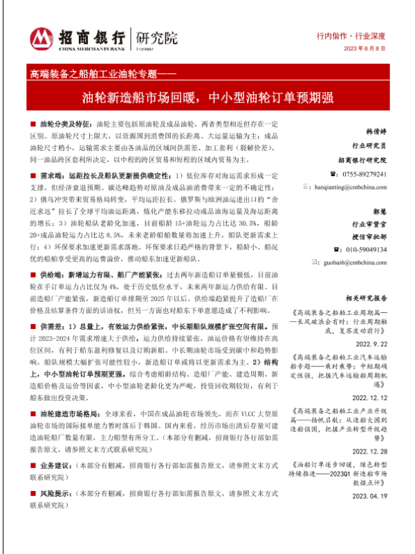 【招商银行】【20230608】高端装备之船舶工业油轮行业专题:油轮新造船市场回暖,中小型油轮订单预期强-24页