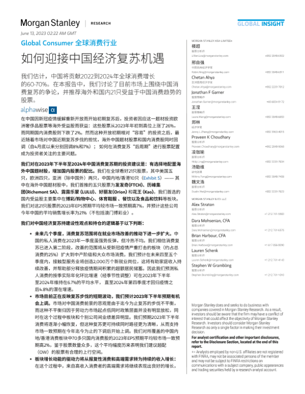 【Morgan Stanley】【20230528】全球消费行业:如何迎接中国经济复苏机遇-8页