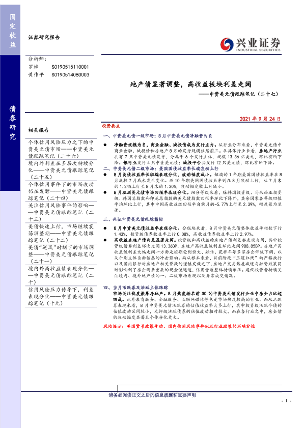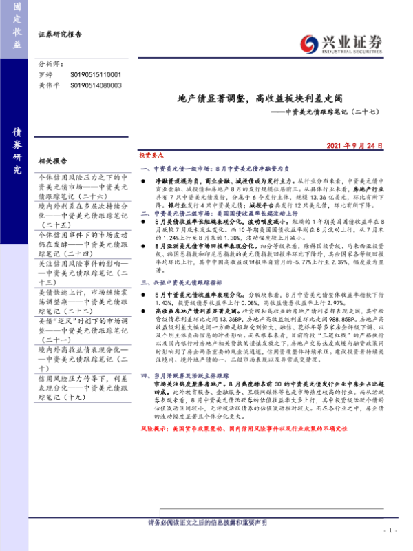 【兴业证券】【20210924】中资美元债跟踪笔记(二十七):地产债显著调整,高收益板块利差走阔-24页