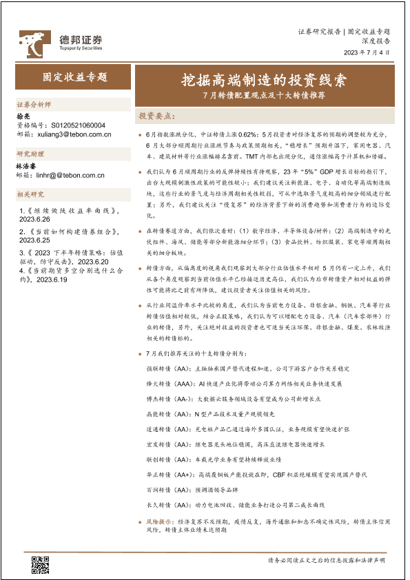 【德邦证券】【20230704】7月转债配置观点及十大转债推荐:挖掘高端制造的投资线索-21页