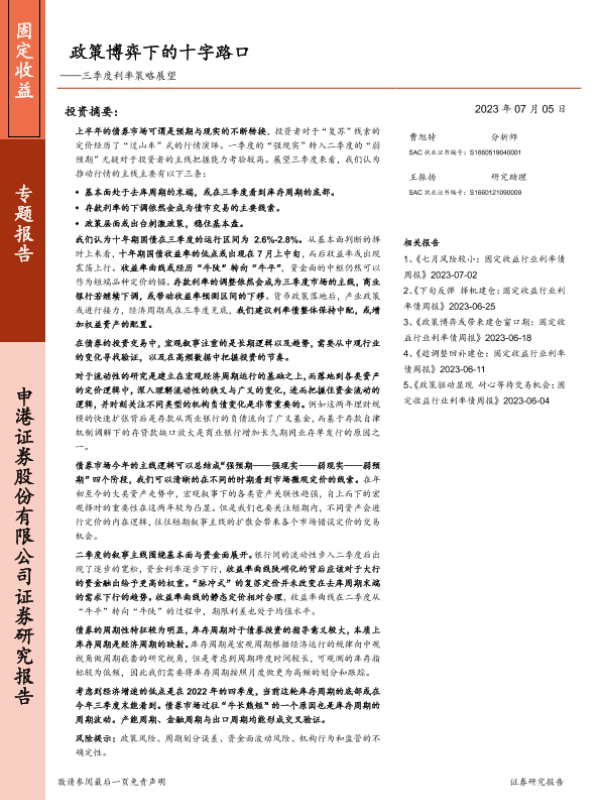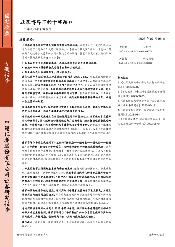 【申港证券】【20230705】三季度利率策略展望:政策博弈下的十字路口-20页