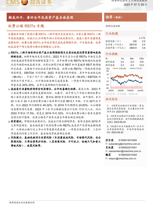 【海通证券】【20230705】交通运输行业收费公路REITs专题:触底回升,看好全年底层资产基本面表现-21页