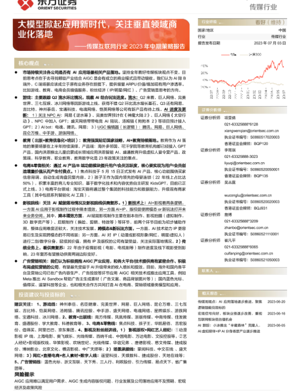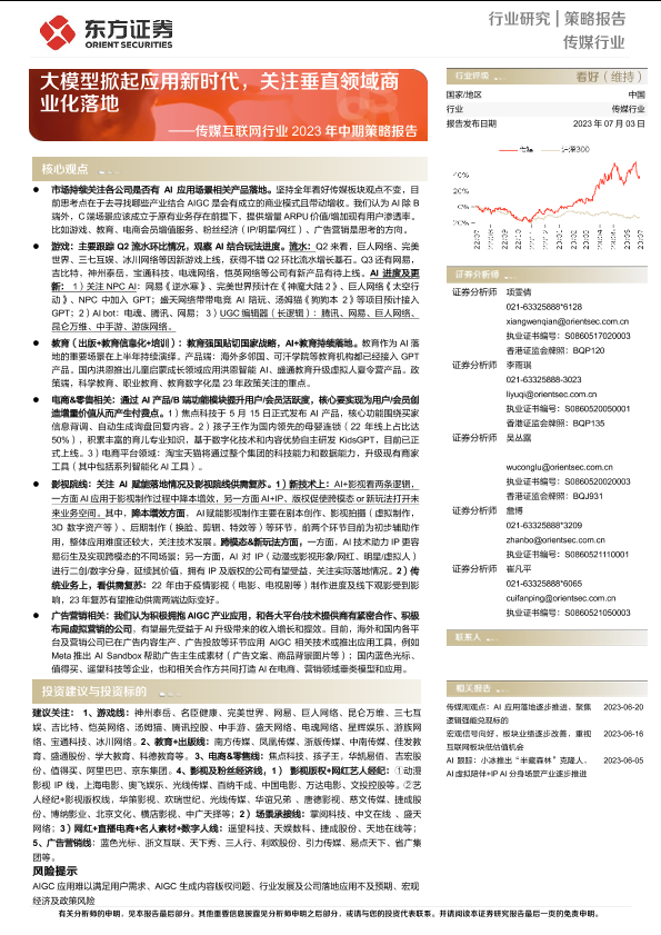 【东方证券】【20230703】传媒互联网行业2023年中期策略报告:大模型掀起应用新时代,关注垂直领域商业化落地-61页