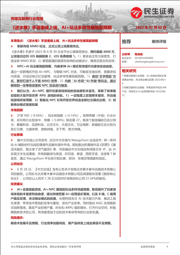 【民生证券】【20230702】传媒互联网行业周报:《逆水寒》手游重磅上线,AI+玩法多样性展现超预期-22页