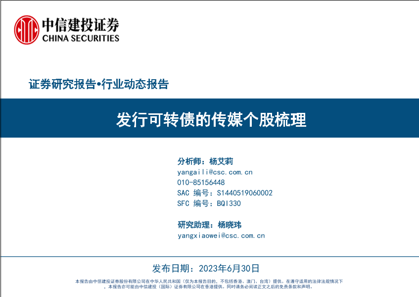 【中信建投证券】【20230630】传媒行业:发行可转债的传媒个股梳理-60页