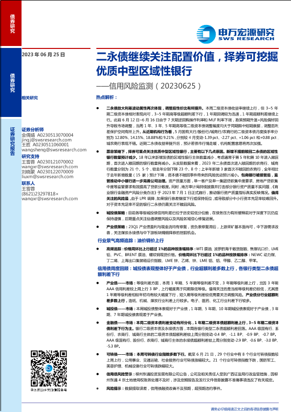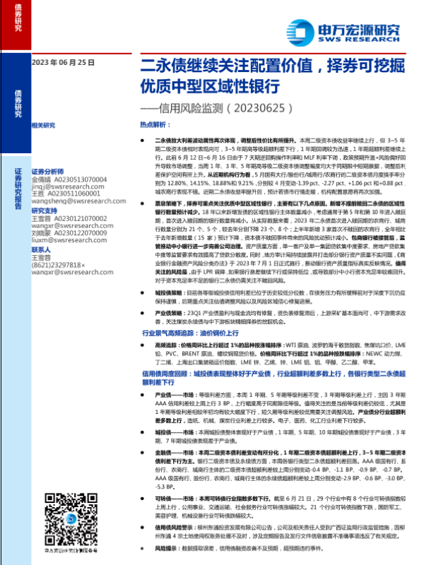 【申万宏源】【20230625】信用风险监测:二永债继续关注配置价值,择券可挖掘优质中型区域性银行-12页