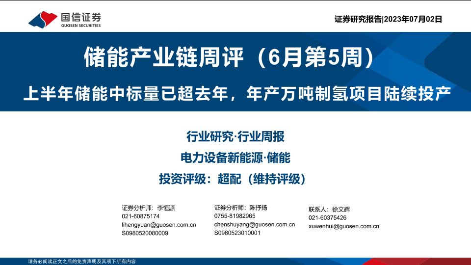 【国信证券】【20230702】储能产业链周评(6月第5周):上半年储能中标量已超去年,年产万吨制氢项目陆续投产-27页