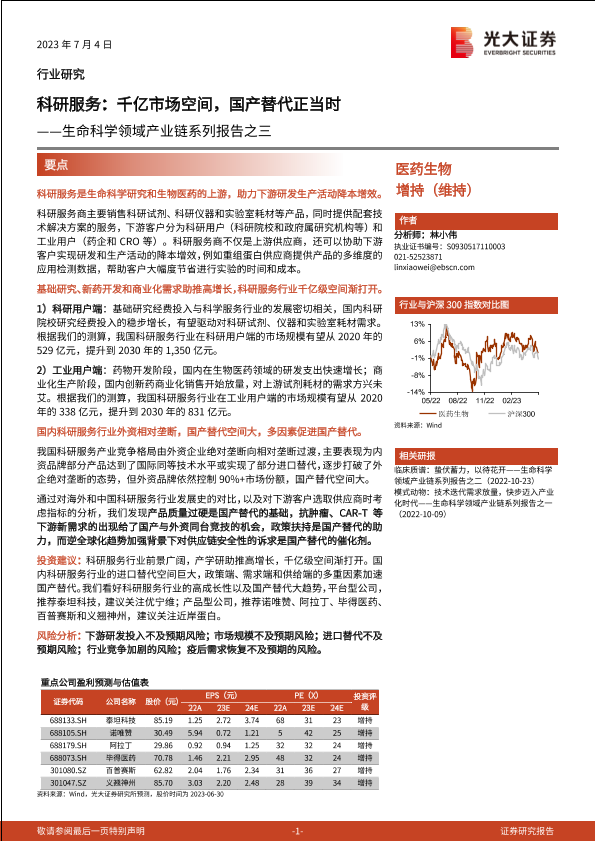 【光大证券】【20230704】医药生物行业生命科学领域产业链系列报告之三:科研服务,千亿市场空间,国产替代正当时-62页