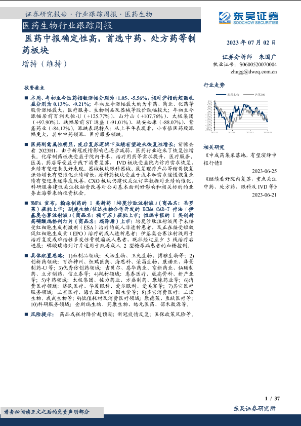 【东吴证券】【20230702】医药生物行业跟踪周报:医药中报确定性高,首选中药、处方药等制药板块-37页