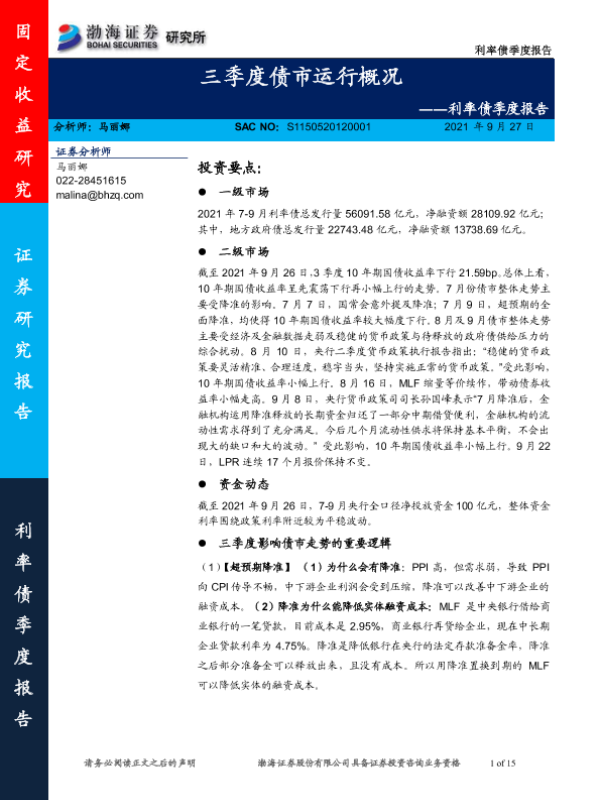 【渤海证券】【20210927】利率债季度报告:三季度债市运行概况-15页