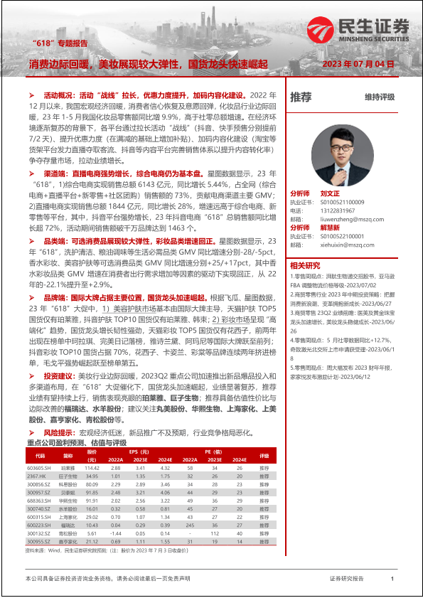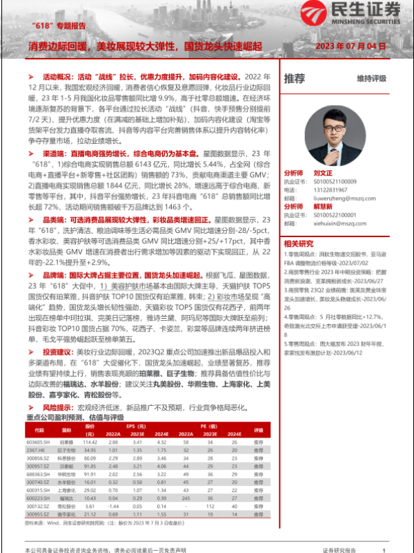 【民生证券】【20230704】商贸零售“618”专题报告:消费边际回暖,美妆展现较大弹性,国货龙头快速崛起-22页