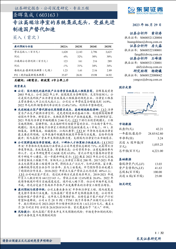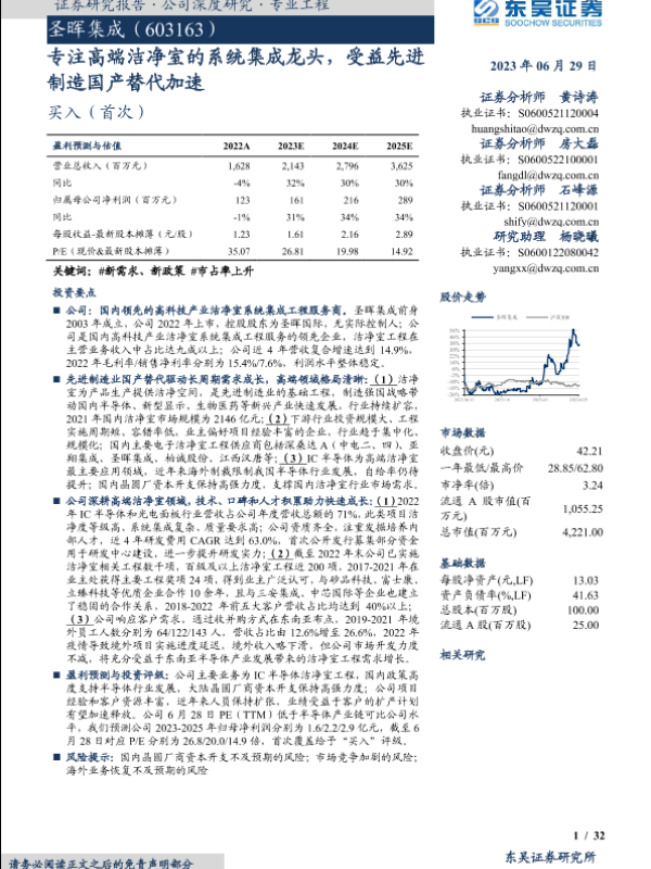【东吴证券】【20230629】圣晖集成603163.SH专注高端洁净室的系统集成龙头,受益先进制造国产替代加速-32页