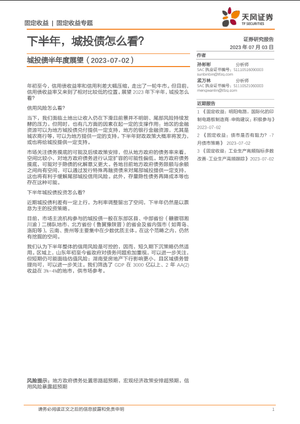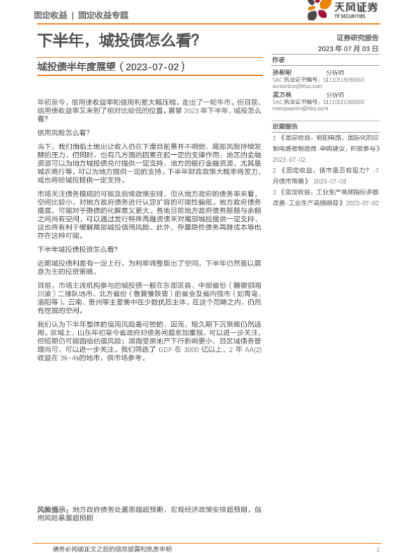 【天风证券】【20230703】城投债半年度展望:下半年,城投债怎么看?-31页