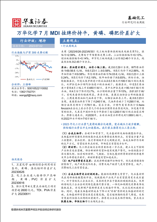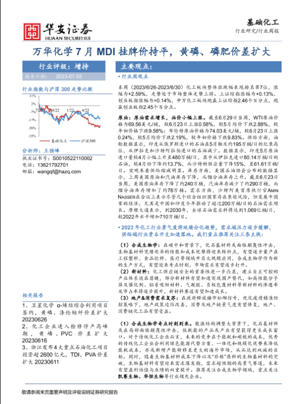 【华安证券】【20230702】基础化工行业周报:万华化学7月MDI挂牌价持平,黄磷、磷肥价差扩大-43页