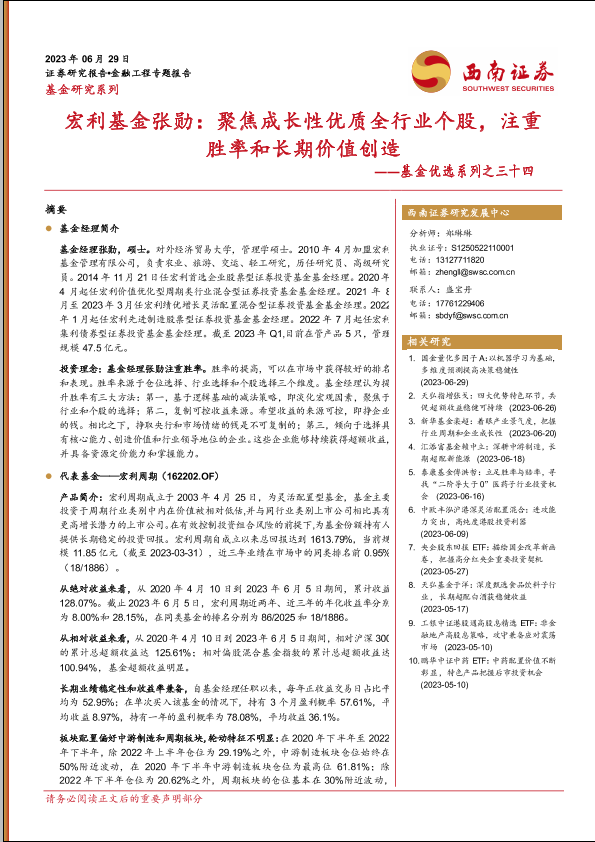 【西南证券】【20230629】基金优选系列之三十四:宏利基金张勋,聚焦成长性优质全行业个股,注重胜率和长期价值创造-23页