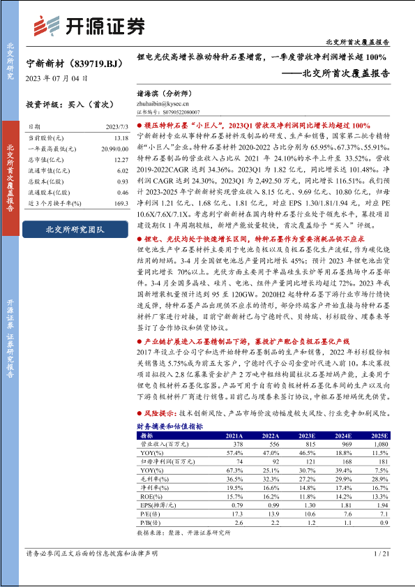 【开源证券】【20230704】宁新新材北交所首次覆盖报告(839719):锂电光伏高增长推动特种石墨增需,一季度营收净利润增长超100%-21页