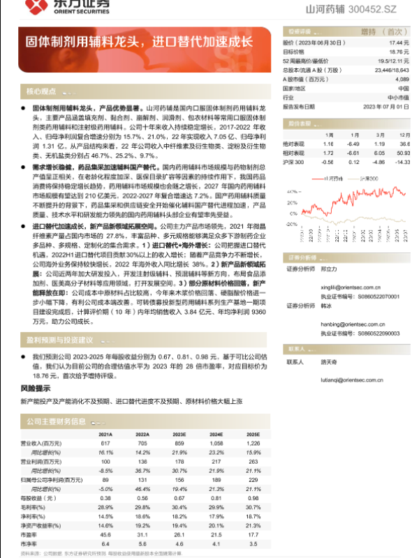 【东方证券】【20230701】山河药辅(300452)固体制剂用辅料龙头,进口替代加速成长-27页