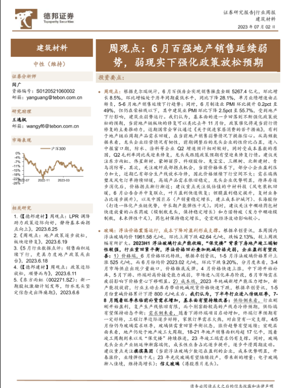 【德邦证券】【20230702】建筑材料周观点:6月百强地产销售延续弱势,弱现实下强化政策放松预期-30页