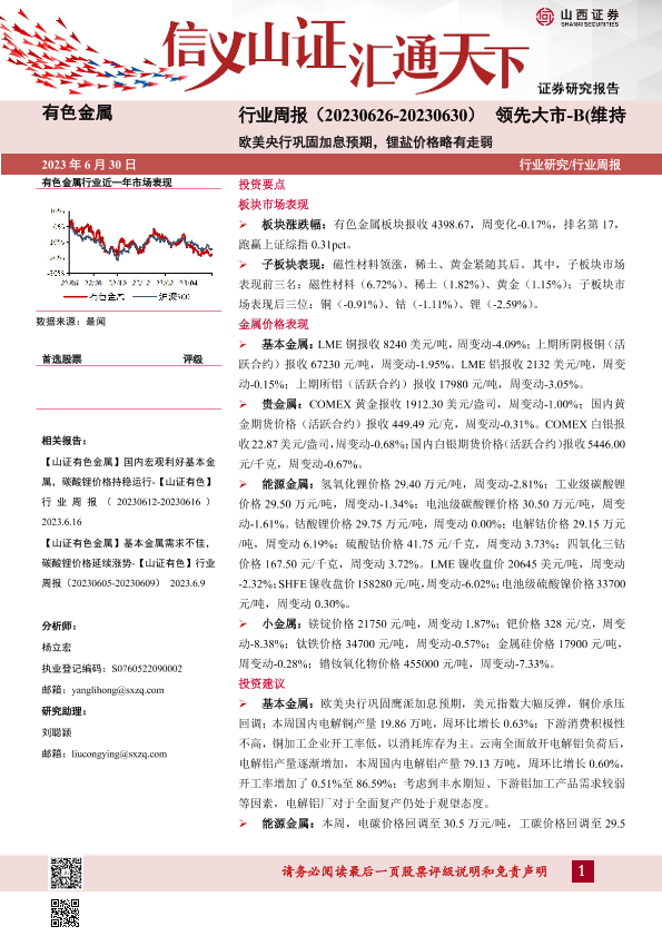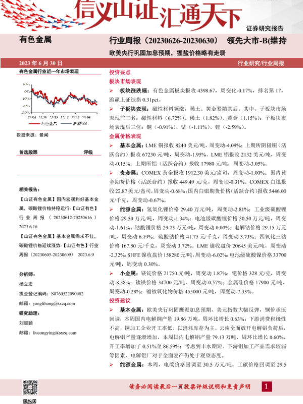 【山西证券】【20230630】有色金属行业周报:欧美央行巩固加息预期,锂盐价格略有走弱-18页