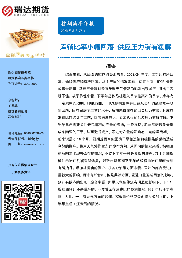 【瑞达期货】【20230627】棕榈油半年报:库销比率小幅回落,供应压力稍有缓解-14页