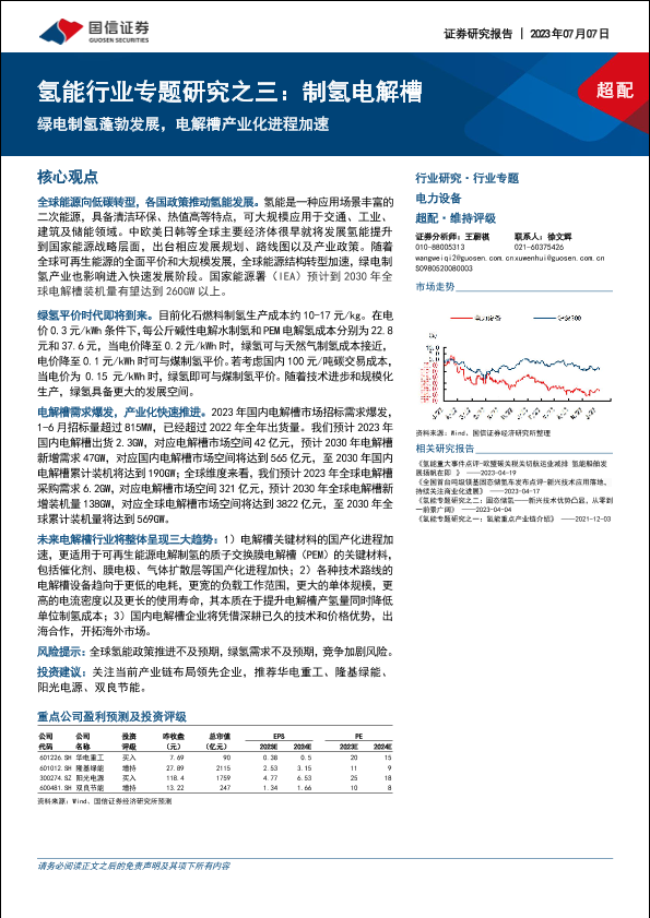 【国信证券】【20230707】氢能行业专题研究之三:制氢电解槽,绿电制氢蓬勃发展,电解槽产业化进程加速-34页