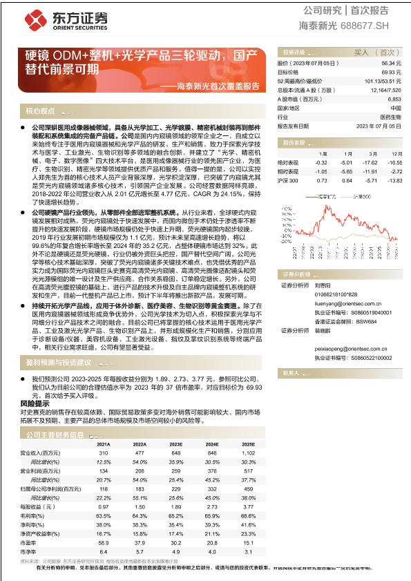 【东方证券】【20230705】海泰新光首次覆盖报告:硬镜ODM+整机+光学产品三轮驱动,国产替代前景可期-44页