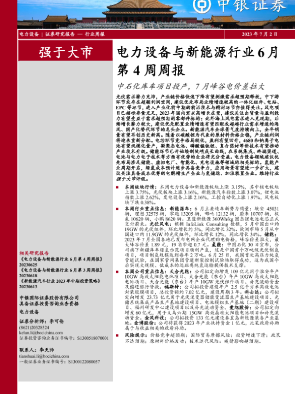 【中银证券】【20230702】电力设备与新能源行业6月第4周周报:中石化库车项目投产,7月峰谷电价差拉大-20页