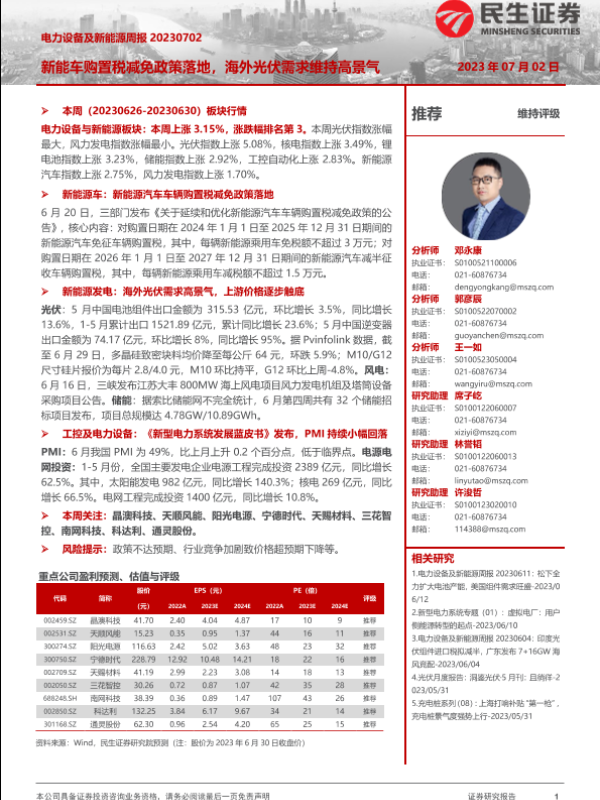 【民生证券】【20230702】电力设备及新能源周报:新能车购置税减免政策落地,海外光伏需求维持高景气-28页