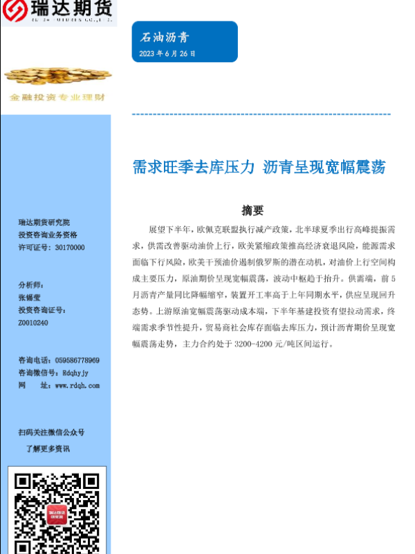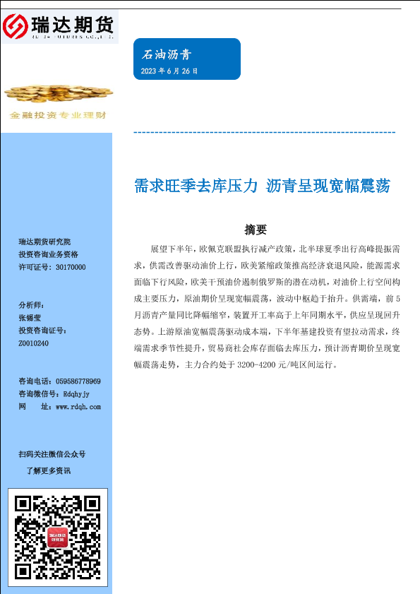 【瑞达期货】【20230626】石油沥青:需求旺季去库压力,沥青呈现宽幅震荡-12页