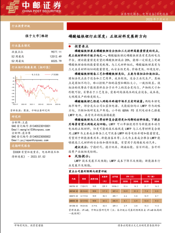 【中邮证券】【20230704】磷酸锰铁锂行业深度-正极材料发展新方向-20页