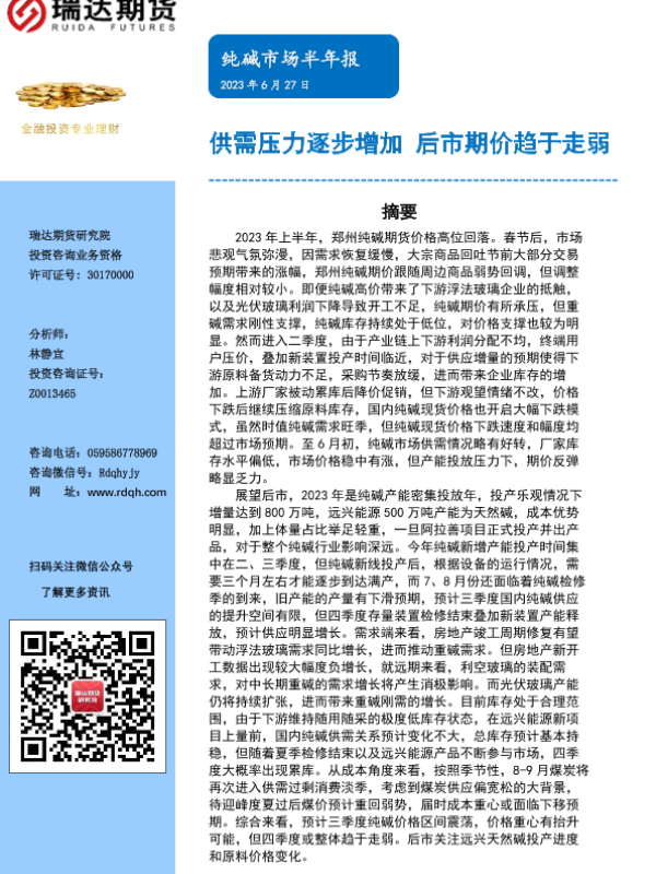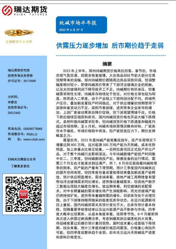【瑞达期货】【20230627】纯碱市场半年报:供需压力逐步增加,后市期价趋于走弱-14页