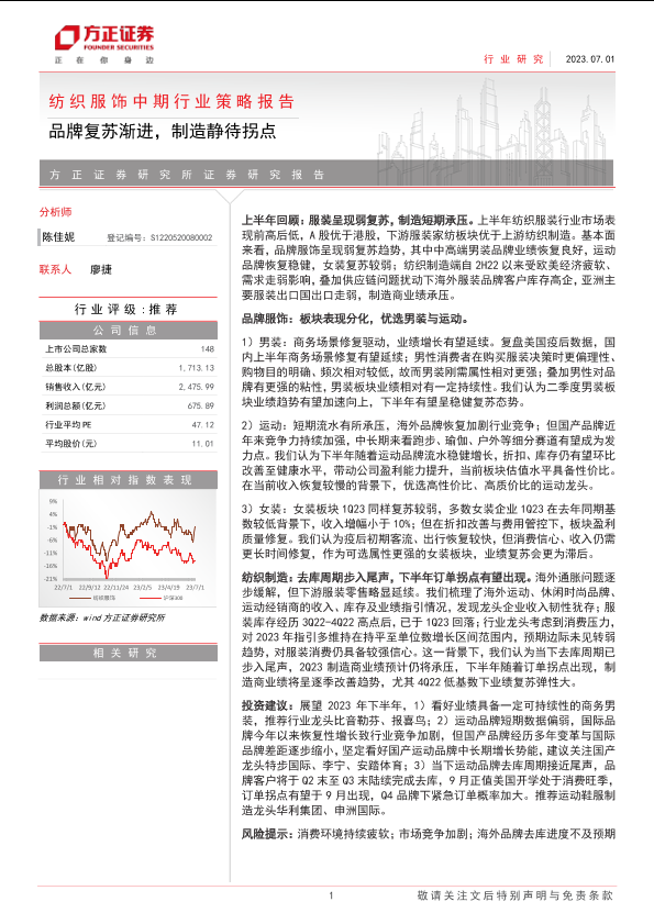 【方正证券】【20230701】纺织服饰中期行业策略报告:品牌复苏渐进,制造静待拐点-27页