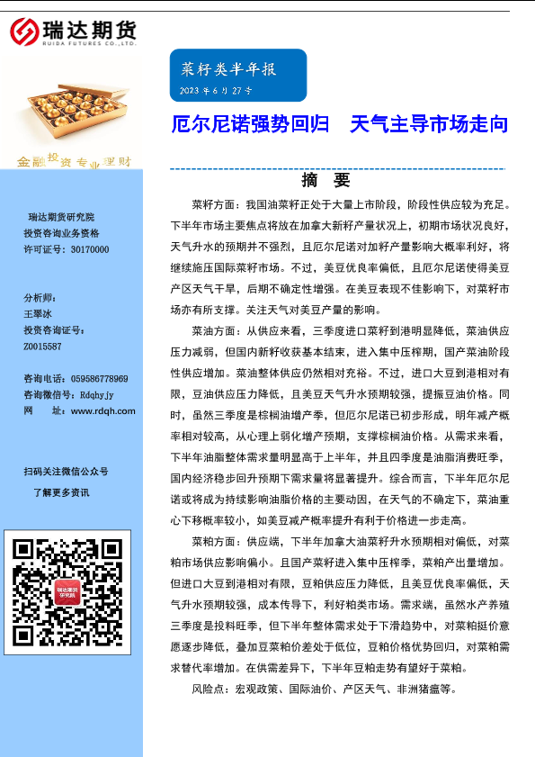【瑞达期货】【20230627】菜籽类半年报:厄尔尼诺强势回归,天气主导市场走向-19页