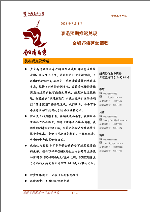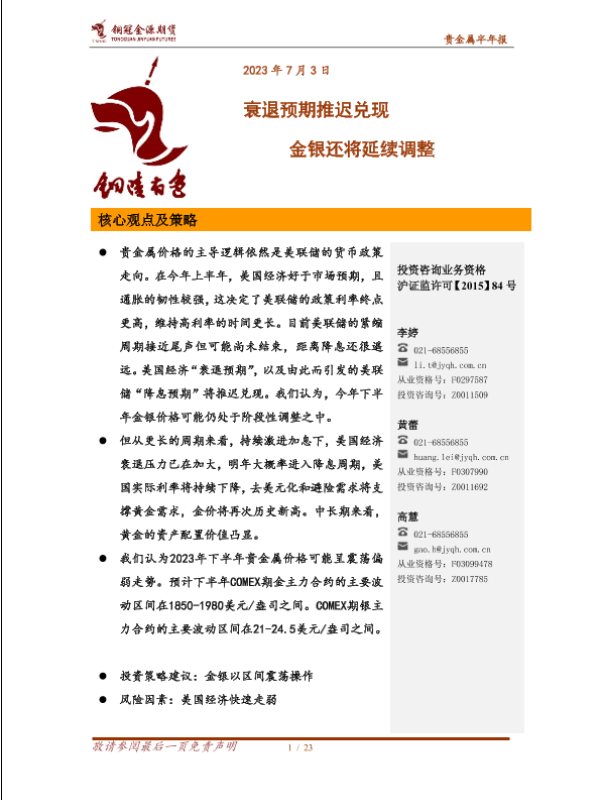 【铜冠金源期货】【20230703】贵金属半年报:衰退预期推迟兑现,金银还将延续调整-23页