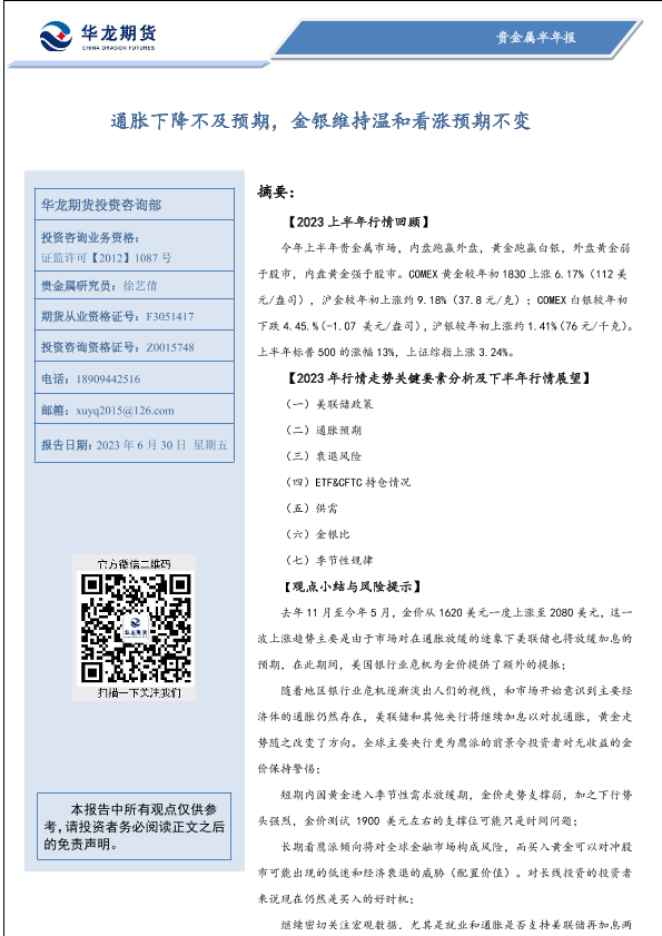 【华龙期货】【20230630】贵金属半年报:通胀下降不及预期,金银维持温和看涨预期不变-20页