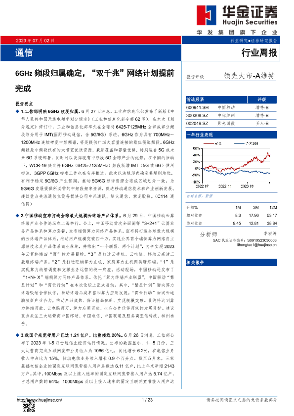 【华金证券】【20230702】通信行业周报:6GHz频段归属确定,“双千兆”网络计划提前完成-23页