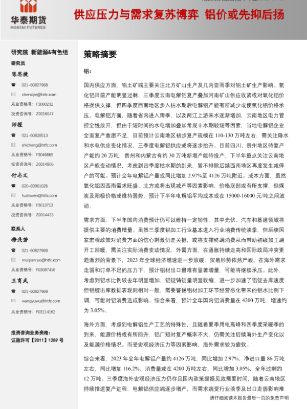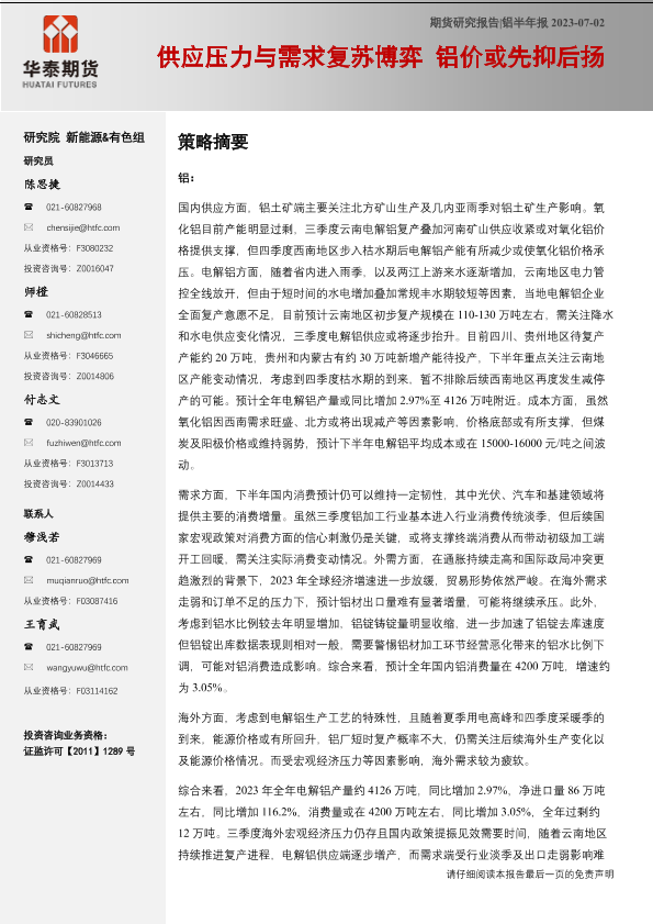 【华泰期货】【20230702】铝半年报:供应压力与需求复苏博弈,铝价或先抑后扬-34页