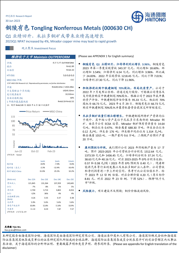 【海通国际】【20230704】铜陵有色(000630)Q1业绩回升,米拉多铜矿或带来业绩高速增长-21页