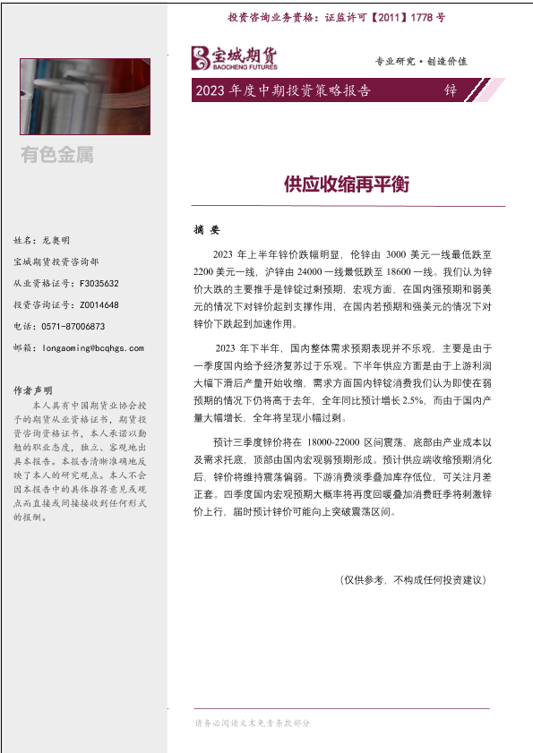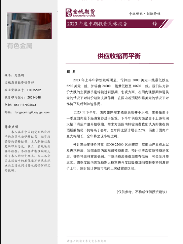 【宝城期货】【20230630】锌2023年度中期投资策略报告:供应收缩再平衡-20页